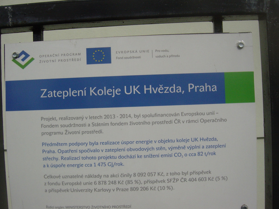 Dotace EU požadovala i Univerzita Karlova. Jedním z jejich projektů je zateplení budov koleje Hvězda. Měly být zatepleny obvodové stěny tří budov, Akce byla dotována z rozpočtu Evropské unie v letech 2013 - 2014. To potvrzuje i tabulka u třetí ze zateplovaných budov. První dvě budovy byly zatepleny rychle do zhruba půl roku. Třetí byla také zateplena rychle, ale stále nějak není dokončena a to už pomalu máme polovinu roku 2017, tudíž běží třetí rok po termínu, kdy to mělo být dokončeno. Znamená to, že Univerita Karlova bude muset všechny prostředky vracet? Kdo je za to odpovědný? Jestliže stavba stále je prázdná a není dokončena a používána studenty k bydlení, tak asi je to nedostakem financí na její dokončení? Kam zmizely peníze určené na dokončení této staby? Kolik podobných dotací šlo na další podpory jiných projektů Univerzity Karlovy?