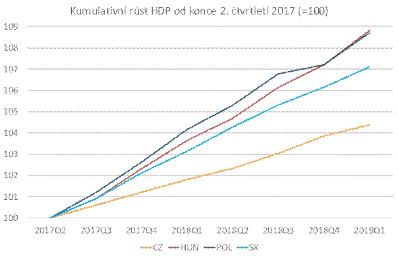 Česká ekonomika vzrostla v prvním čtvrtletí letošního roku oproti poslednímu čtvrtletí roku minulého o solidního půl procenta.Vzhledem k tomu, jak se koncem roku vyvíjely předstihové ukazatele zde i v Německu, to je jistě pozitivní překvapení. Ale podívejte se kolem sebe. Už takové Německo rostlo o 0,4 %, a to se v něm skutečně průmyslové produkci moc nevedlo. Český růst však bledne ve srovnání s růstem v okolitých zemích. Polsko rostlo tempem 1,4 % q/q a s výjimkou konce roku 2018 roste tempem nejméně procento q/q nepřetržitě konce roku 2016. Maďarská ekonomika přidala dokonce 1,5 % q/q a zaznamenala deváté čtvrtletí v řadě s mezičtvrtletním tempem růstu nejméně 0,9 %. Slovenská ekonomika přidala 0,9 % a v posledních devíti čtvrtletích nerostla mezičtvrtletním tempem pomalejším než 0,8 % q/q.