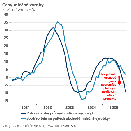 Ceny zemědělských výrobců a zejména potravinářů nás v lednu překvapily daleko prudším poklesem, než jsme očekávali.Ceny zemědělských výrobců byly v lednu nižší zejména díky rostlinné výrobě o 5,8 % (meziročně). U navazujících producentů potravin sice tak výrazné zlevňování nevidíme (-1,4 %), ceny v některých kategoriích v čele s „mlékaři“ a v Čechách tolik skloňovaným máslem však padají nečekaně prudce (-4,5 % v průměru celá kategorie). Minimálně část tohoto „výrobního překvapení“ se navíc zatím nedostala na pulty ke spotřebitelům. Proto snižujeme odhad vývoje cen potravin v obchodech pro nadcházející měsíce a celý letošní rok z 2,5 % na 1 %. A to bude mít dopad i na náš odhad celkové inflace, který zatím snižujeme pro celý rok 2026 z 1,5 % na 1,4 %. Měla by na to reagovat centrální banka? Tedy, jak se ptáme v úvodu, může vést levnější máslo nakonec i k levnějším hypotékám?