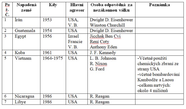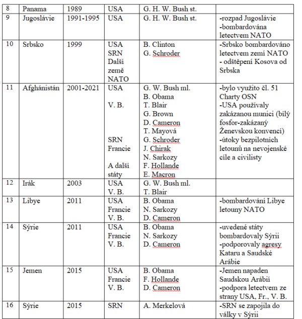 Udělám jen stručný výčet vojenských akcí a válek, které byly vedeny některými členskými státy NATO nejen v rozporu s čl. 1 Washingtonské smlouvy (přístupová smlouva k NATO), ale především v rozporu s Chartou OSN a bez souhlasu RB OSN. Abych ten přehled trochu zkrátil, začnu jejich výčet až rokem 1949 (po založení NATO).