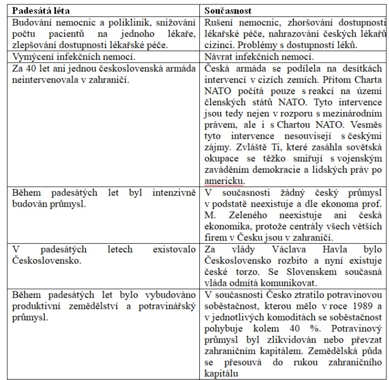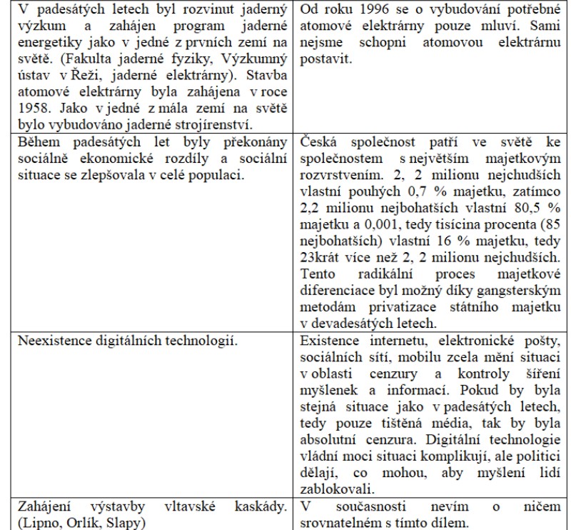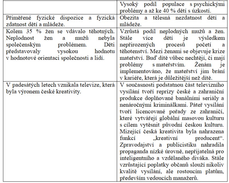 Čím jsou především společnosti padesátých a současných let rozdílné je trend. V padesátých letech jsme byli krátce po válce, a proto situace byla na počátku padesátých let obtížná, včetně potravinových lístků , ale ve všech oblastech se situace postupně zlepšovala. Současná kapitalistická společnost navazuje na stav socialistické společnosti v roce 1989. Výchozí pozice byla samozřejmě nesrovnatelně lepší než na počátku poválečných padesátých let. V současnosti je však trend permanentního zhoršování ve většině oblastí. Příkladem může být otázka bydlení a slavný výrok Václava Havla, že byty v paneláku jsou nedůstojné králikárny. Tyto nedůstojné socialistické králikárny mají po 35 letech kapitalistického budování v současnosti hodnotu několika milionů a pro mladé lidi s průměrnými příjmy jsou nedostupné.