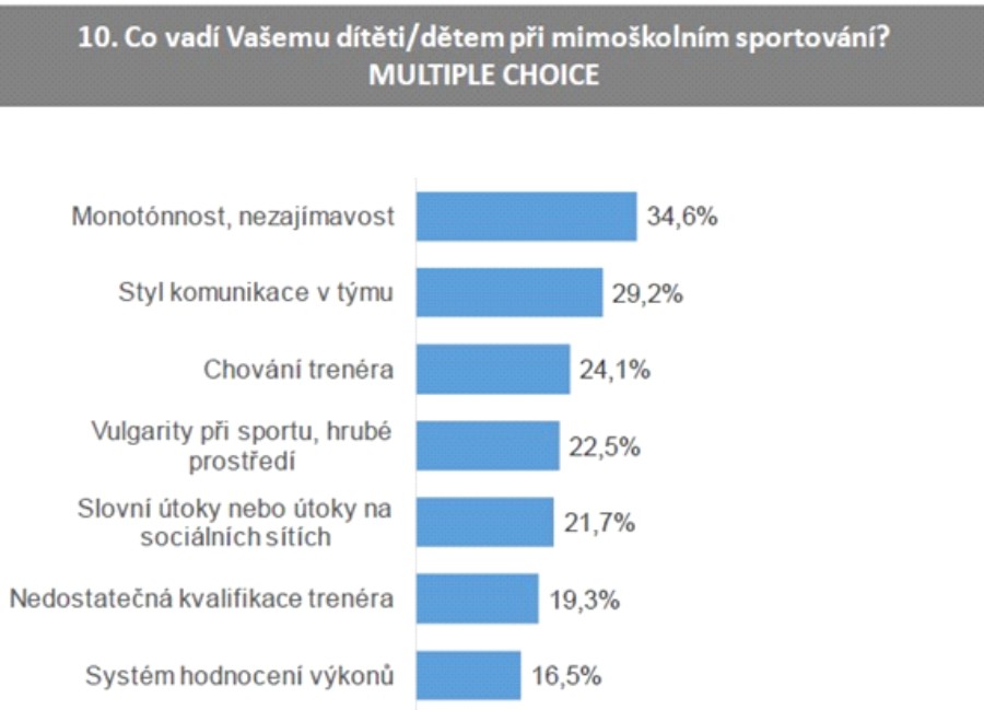 Minule jsme se trochu podívali na velkou skupinu dětí, které vůbec nesportují (téměř 37 %!), a na důvody, proč nesportují.Dnešní graf se týká dětí, kterým sice při procesu tréninků a závodů něco vadí, ale přesto sportují.