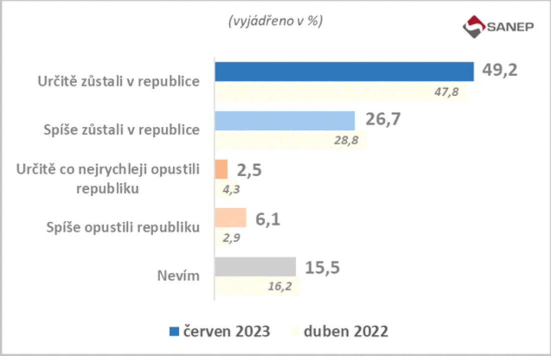 Výsledky se meziročně příliš neliší, ale všimněte si, že v případě války na našem území by téměř jeden milion lidí určitě (2,5 %) nebo spíše (6,1 %) opustil naši republiku! (Vycházím z údaje o počtu obyvatel k letošnímu 31. březnu, kdy ČR měla 10 850 620 obyvatel.) V případě, že by se pro odchod z republiky rozhodla také část velké skupiny dosud nerozhodnutých (15,5 %), byl by počet uprchlíků ještě výrazně vyšší. Přiznávám, tak vysoké číslo jsem nečekal!