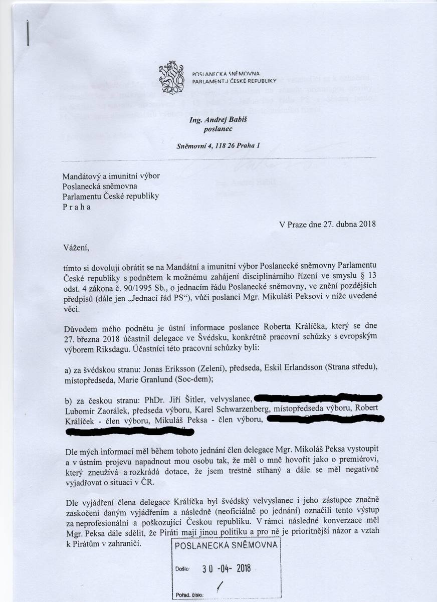 Koncem dubna 2018 se objevila zpráva, že na jednání zástupců parlamentů České republiky a Švédska dne 27. března 2018 ve Švédsku, měl poslanec Mikuláš Peksa oficiálně prohlásit o panu Ing. Andreji Babišovi, že zneužívá a rozkrádá dotace – viz dokument Ing. Andreje Babiše ze dne 27. dubna 2018, podaný Poslanecké sněmovně Parlamentu ČR.