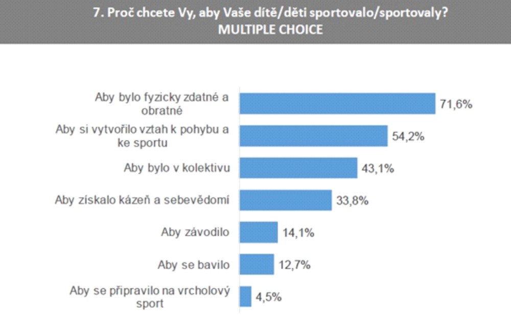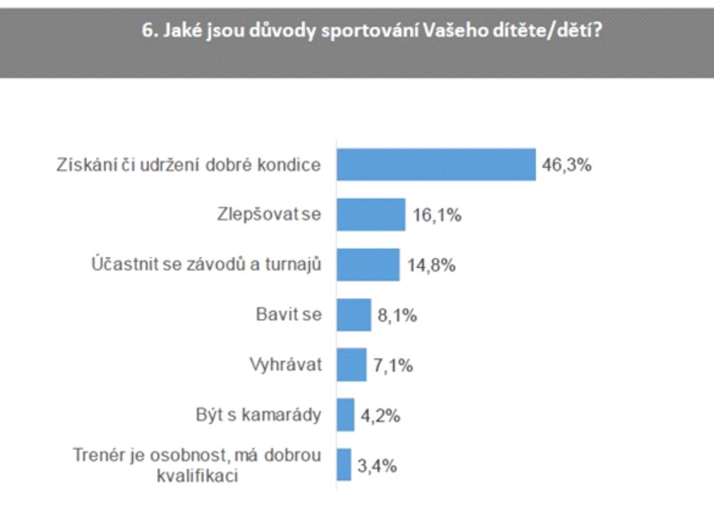 Možná pro někoho opět překvapivá data, ale vidíme, že rodiče, kteří chtějí, aby jejich děti zejména soutěžily a připravovaly se na vrcholový sport, představují výrazně minoritní skupinu. Převážná většina rodičů očekávají, že sport je důležitou a v mnohém nenahraditelnou součástí přípravy dětí na život v dospělosti. Fyzická zdatnost, aktivní a kladný vztah k pohybovým aktivitám, sociální dovednosti, které děti získají ve sportovních kolektivech, či dobrovolná kázeň a pevné sebevědomí, to všechno jsou podstatné atributy, které kvalitně organizovaný sport dětem přináší. Sečteno, podtrženo, motivace ke sportování dětí není ani podle dětí, ani podle rodičů v tom, aby soutěžily a vyhrávaly, nýbrž v tom, aby se připravovaly pro život.