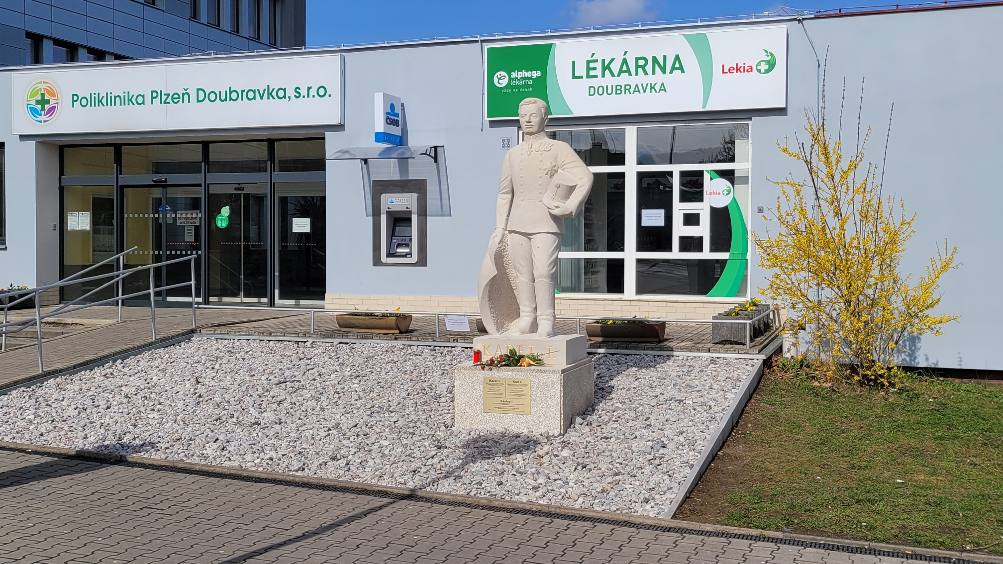 Při návštěvě zdravotnického zařízení, konkrétně polikliniky v Plzni na Doubravce, nedaleko jejího vchodu, čeká zájemce o lékařskou péči zajímavé uvítáníOd minulého měsíce se zde nově tyčí kýčovitá, pískovcová socha mocnáře, posledního rakousko uherského císaře, Karla I. Co k tomu vlastně dodat? Konstatování, že se areál s budovou polikliniky nachází v majetkovém portfoliu společnosti Privamed, a že vlastník si může na svém pozemku nechat postavit sochu prakticky jakoukoliv a kohokoliv. Toto konstatování lze doplnit, že celý objekt byl zbudován pro občany za socialismu zhruba před padesáti léty a možná také tím, že spoluvlastníkem Privamedu je dlouholetý protagonista ODS, první hejtman Plzeňského kraje a poradce expremiéra Nečase Petr Zimmermann. Tím ovšem výčet faktických a nezpochybnitelných dat končí a dále, při pohybu ve směru teoretických úvah, proč sem tuto sochu společnost umístila, v tom nenacházíme významnějšího smyslu a racionality, spíše jen registrujeme neumělý pokus o prapodivnou veřejnou provokaci.