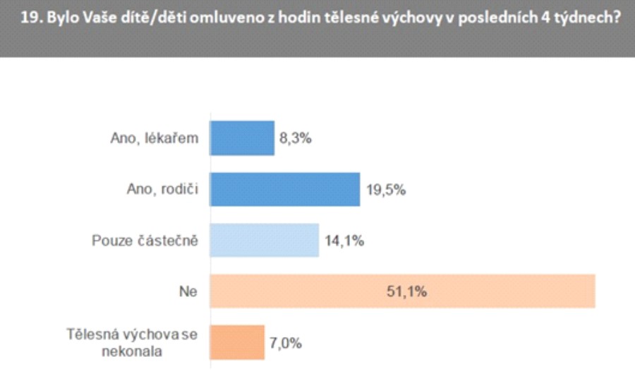 Z grafu vidíme, že v uplynulém kalendářním měsíci se tedy jen polovina dětí účastnila všech hodin TV, a 7 % hodin TV se prostě nekonalo. Proč? Za tělocvik se prostě většinou nesupluje („nejsou lidi“), děti sedí pasivně ve třídě a v lepším případě se vzdělávají v jiných disciplínách. Je také pravda, že zejména na prvním stupni základních škol nerealizují výuku tělesné výchovy učitelé s příslušnou aprobací, nýbrž třídní učitelky…
