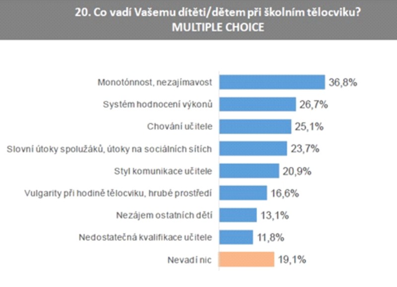 Můžeme vidět, že v hlavní roli se opět ocitá ten, kdo řídí a organizuje výuku, tedy učitel/ka. Jeden údaj je ale pozitivní, že jedné pětině dětí nevadí v hodinách TV nic. „Není to ale málo, Antone Pavloviči?“ Každý z nás by měl podle svých individuálních možností přispět k nápravě tohoto stavu a úsilí společnosti představované orgány státní moci i správy by mělo vést k tomu, aby školní tělesná výchova přestala být mezi ostatními předměty nemilovanou Popelkou, ale stala se plnohodnotnou součástí výchovně vzdělávacího procesu.