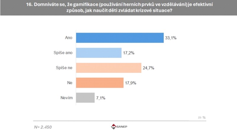 Tady vidíme, že dospělí nejsou o didaktické efektivitě herních prvků v procesu přípravy dětí na zvládání krizových situací zcela jednoznačně přesvědčeni, gamifikaci podporuje polovina dotázaných (50,3 %). Je to málo nebo hodně?