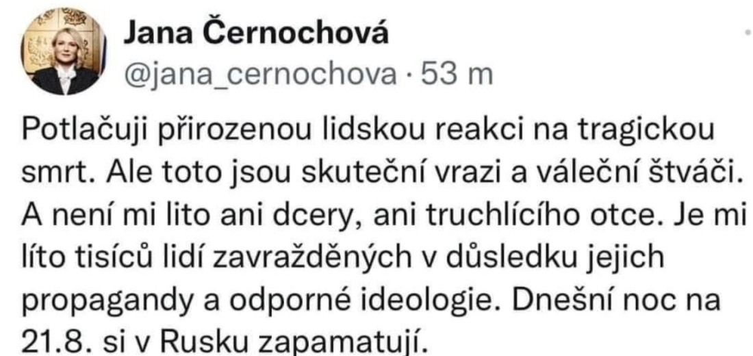 s ohledem na Vaše vyjádření na sociální síti twitter ze dne 21.8.2022, v němž jste uvedla, že Vám „není líto dcery ani truchlícího otce“, Vás tímto otevřeným dopisem vyzývám k neprodlenému podání demise na post ministryně obrany České republiky.